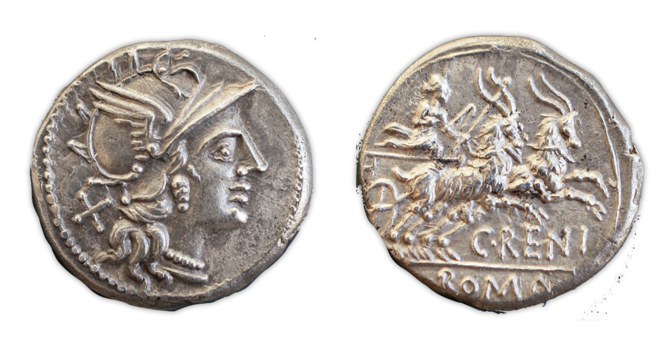 The reverse side depicts Juno, the wife of Jupiter and queen of the gods, in a chariot of goats. In her right hand she holds a sceptre, a common symbol of power among classical deities, and reins for controlling the animals. A whip is seen in her left hand, which serves the purpose of spurring the goats. The exergue, the place on a coin below the principal illustration, usually for inscriptions, reads “C RENI”, with “ROMA” below. This reveals the name of the moneyer, Caius Renius, someone only recognized because of this coin and not from any significant political or military position. In fact, the gens Renia was probably an unknown plebeian family, with no record of any high officeholder of said name. Caius (or Gaius) Renius, most likely a plebeian, would have been a familiar name, though, simply because of his distinct marking on a common coin of ancient Rome.