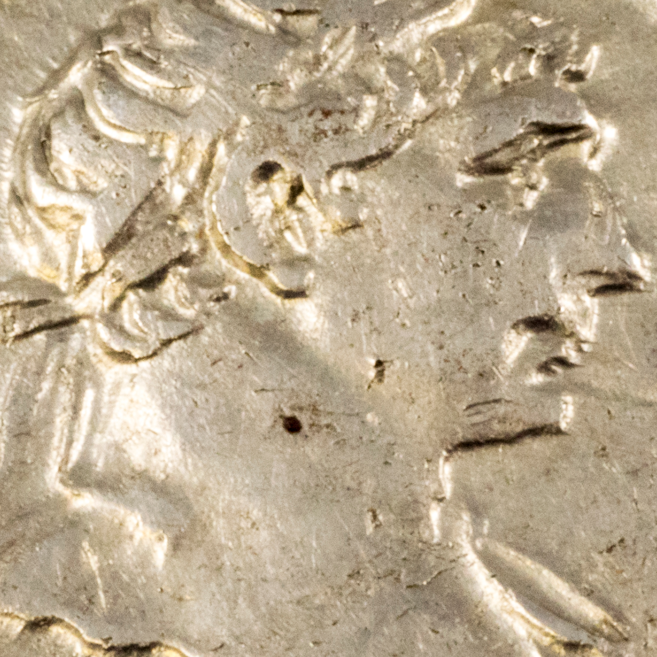 The second coin is also a silver denarius, and depicts on the front a bust of a laureate who has drapery on his shoulder, presumably representing Trajan. The back of the coin depicts Arabia holding a branch and bundle of canes, with a camel at her feet. Arabia represents the Arabian Peninsula personified. Trajan annexed the Arabian Peninsula, and the coin was produced during Trajan’s time as the Roman Emperor to commemorate the annexation. The branch and bundle of canes are thought to represent cinnamon branches, as cinnamon was a main export of the Arabian Peninsula before and after Trajan annexed it.